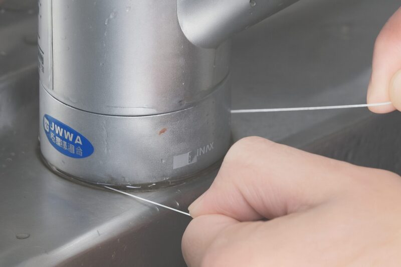 ひもを蛇口の隙間に通して左右に動かすだけ。専用ブラシ不要で、入り込んだ黒ずみが驚くほど落ちます。